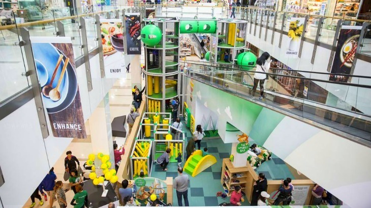 On the ground level next to the Jacaranda tree, you’ll find a soft play area for children opposite the Just Jeans.