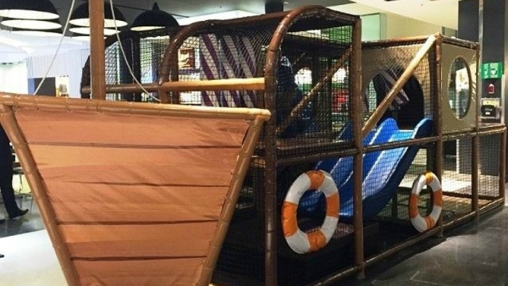 The pirate shaped playground is no longer there, however there is a play area on the lower level near MyHouse. There is also a Playtime full of arcade games and a SkyZone.