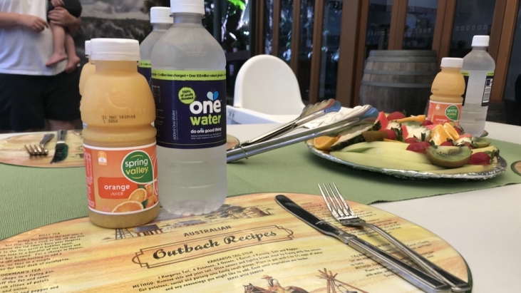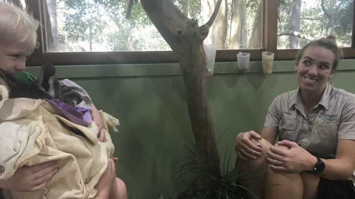 Our day started early as we had arranged to have a private encounter breakfast with a Koala, which starts at 8:15. We arrived to find our table set with juices, a fresh fruit platter, pastries and water. Our coffee orders were quickly taken and we each talked about what animals we were most looking forward to seeing. At around 8:30, the delightful Monty (a juvenile Koala who was born at the park) and his keeper joined us and we got to talk all about Koalas for the next half-an hour. Monty’s keeper was very knowledgeable about Koalas and she was fantastic in engaging with our boys – she had answers to the many, many, important questions like “Do Koala’s wee and poo up in the tree or do they have to climb down to do it?”.