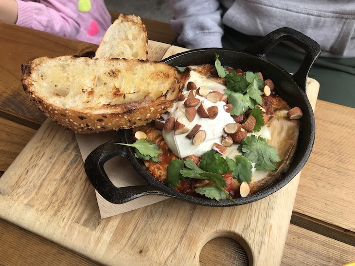 The adults had the shakshuka with harissa, eggplant and peppers, smoked almonds, labne, coriander and charred Turkish bread ($18.90) and the spicy tofu bao: soft, pillowy steamed bao buns filled with crispy tofu, house pickled carrot and cucumber, fresh Asian herbs, peanuts, spring onion and gojuchang mayo ($15 for two).