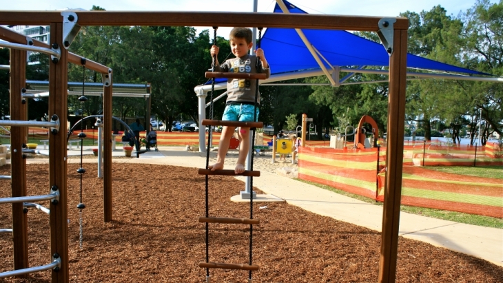 So, what did we find? Well, have you noticed the trend in new playgrounds, where the equipment seems to blend into its environment? Gone are the garish, plastic-fantastic look playgrounds of our childhoods. These days parks look less like McDonalds and more like bushland jungle gyms! Right now Cahill Park looks like a half-opened Christmas present with its brightly coloured temporary fences, but take away the packaging and this playground is a oil painting of timber, ropes and earthy colour schemes. Perfect for backyard-less, apartment living kids like mine!