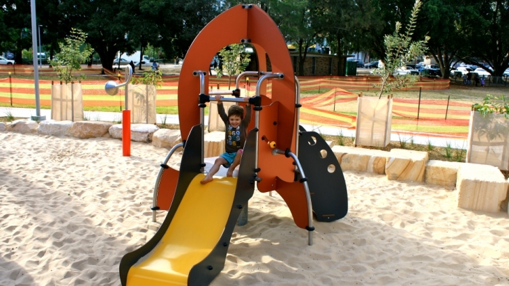 It caters to kids of all ages - I even saw some teenagers excercising on the balance beams - and there are lots of shaded areas for grown-ups to sit. Kids can play on the netted climbing dome, swings, monkey bars, a spinning dish and one of those nouveau see-saws that spin around and look like mobile cranes.
