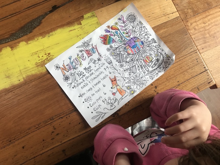 What makes the cafe kid-friendly? The menu that kids will actually eat (and they can colour in!), plenty of space in the cafe and outdoors for prams, lots of highchairs, and lovely outdoor play area.