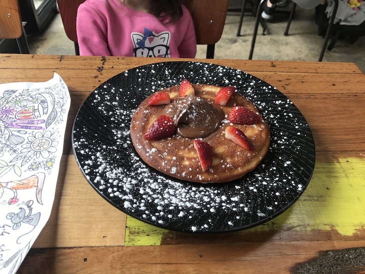 For kids, there is the choice of pancakes with Nutella and strawberries, eggs and toast, a ham and cheese toastie, and chips with sauce.