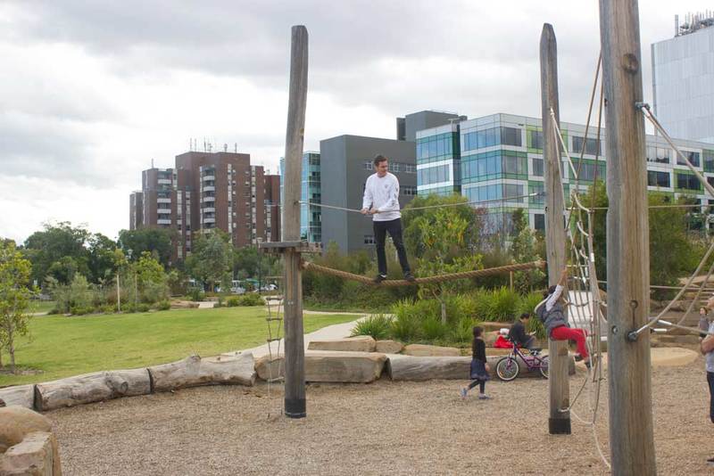 No plastic or bright colours here, instead you'll find climbing frames, water play, bridges, slides and swings made from wood, steel and rope - all materials that are in keeping with the natural, bush-like environment.