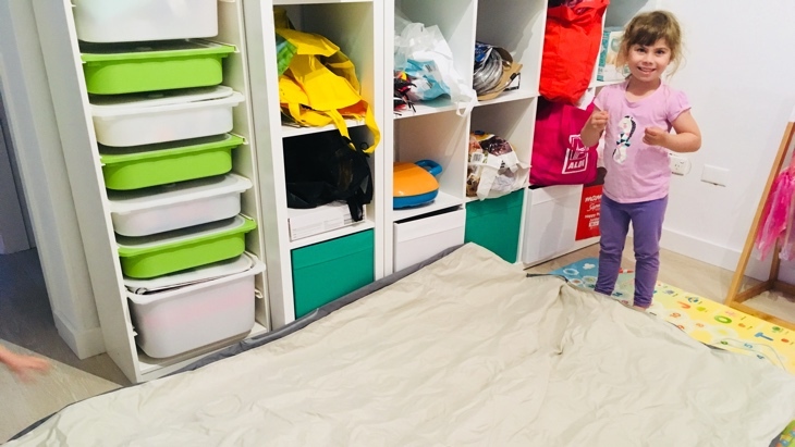 In prep, Hubby and I walked around the rooms - playing virtual Tetris! "Move the kids’ beds into our room….push the cupboards over there"…. And then, once we’d created space from nothing, the question remained, what do they sleep on? There’s certainly no room for an additional bed but more importantly, there is nowhere to store it after they leave.