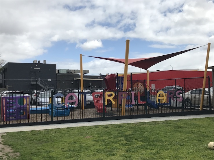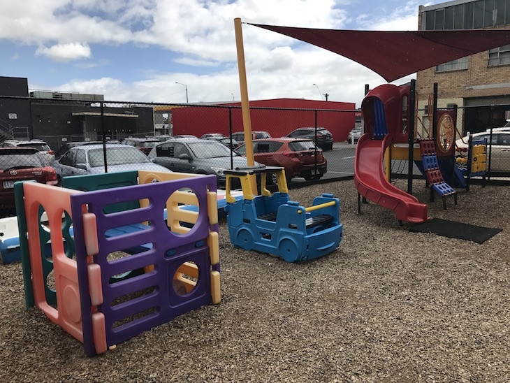 The outdoor play area is fully fenced, and there is a shade sail over part of it. There is plenty of climbing equipment, a cute mini car and twisty red slide are accessible for most ages. The indoor play area is spacious and full of great stuff to play with, tables and chairs for eating or drawing, and several couches and chairs to sit on.
