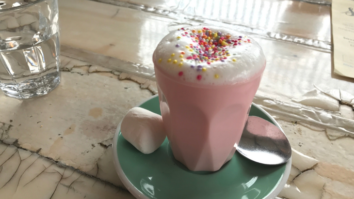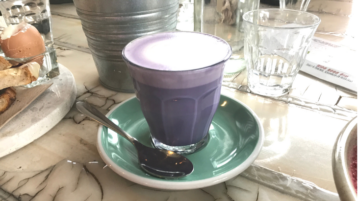 We opted for the kids' dippy eggs with cheese soldiers, the peach and avocado bruschetta with extra egg (turmeric cream cheese, kale pomegranate, salsa, candied beets, dukkah, candied seeds, and beetroot hummus with a balsamic reduction on sourdough, $20), a bright purple taro latte ($6), and a choc wow smoothie (banana, cacao, almond milk, ice and cinnamon, $9).