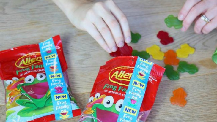 Hopping onto Coles and IGA shelves from this week are 'Allen's Frog Family' share packs, containing, red, orange, yellow, and GREEN frogs!