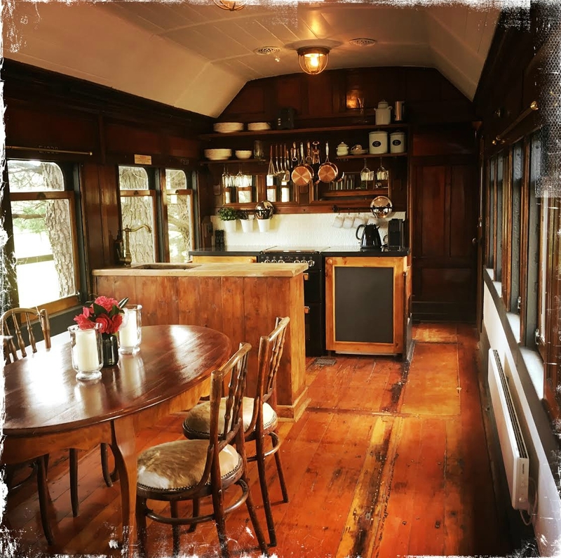 A stylised second carriage, the 1238 (above) from the 1920s, features original sliding doors and lies closer to the house, and so is isn't solar-powered. It sleeps five thanks to a king bed and a triple bunk, with the main bed taking up the entire main bedroom. The kids will love stepping back in time as they play by the original train seat on the other end of the carriage, where there's also a kitchenette, and outside, a porch complete with a BBQ and lush paddock views.