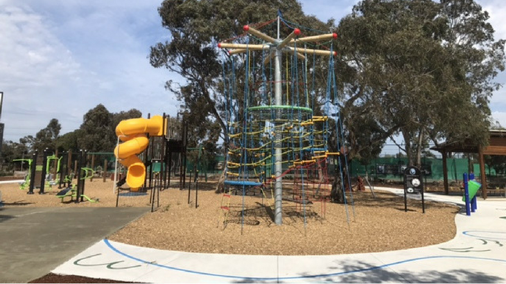 The playground is situated right next to full-sized basketball courts, an extensive skate park, and sporting fields, and boasts three huge towers, nature play area, sandpit, massive twisty slides, pentagon swing set, ropes, tunnels and rope tunnels, bridges, smaller slides, rock climbing features, carousel, birds nest swing, and meandering water play area with fountains and pumps.