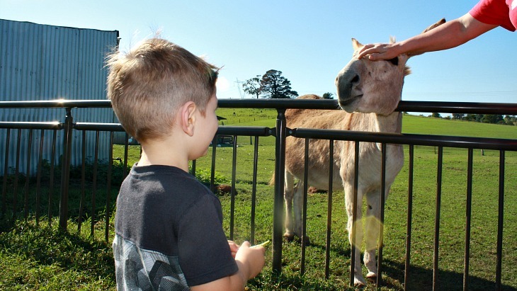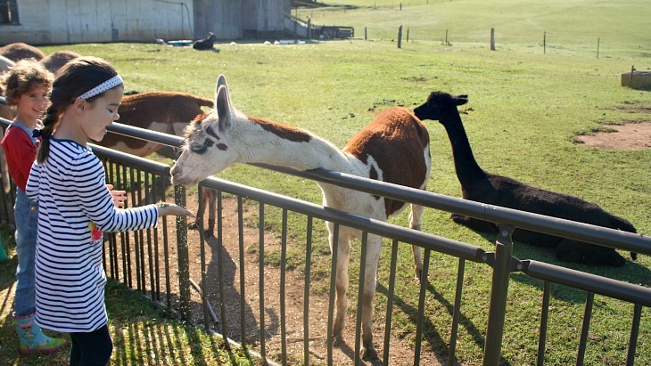 Ah the serenity - it was so nice not to wake up to the sounds of airplanes roaring above our building. Instead, we awoke to a rooster calling us and summoning us to a hot breakfast. Is there anything better than bacon and eggs cooked from fresh farm produce? I really don't think so. Actually there is one better thing and that's not having to clean up after meals! Everything is taken care of here, that's a true holiday for us parents. After brekkie we jumped back on the tractor to experience some more farm life. This time we were taken down to the Farmyard Nursery where the kids got the chance to milk the cows, collect eggs and feed the farm animals - including alpacas! My son also loved seeing the ducks which waddled around outside freely.