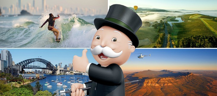 So which parts of Australia took out prime Monopoly real estate? NSW country town Orange and Sydney Harbour occupy the dark blue part of the board, where Mayfair and Park Lane sit on the original game. Other destinations on the 22-spot board game include ACT's Questacon, the War Memorial, and Canberra itself which occupy the red section of the board, traditionally positions belonging to The Strand, Fleet Street and Trafalgar Square. Queensland's Whitsundays, the Gold Coast and Tropical North Queensland all made it on too, along with Tassie's Hobart, Freycinet National Park and Stanley, South Australia's Barossa Valley, Kangaroo Island and Port Lincoln, Western Australia's Esperance, Broome and Margaret River, the Northen Territory's Alice Springs and Darwin, and Victoria's Great Ocean Road, Melbourne and Phillip Island.