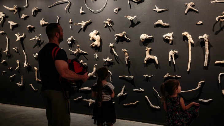 Our favourite exhibition in the gallery was Today, Tomorrow, Yesterday, an exhibition of works from the MCA's own collection. It was filled with some amazing pieces, the favourites being Manuhiri (Travellers) by Fiona Hall (a selection of found wood in the shapes of various animals, we had lots of fun saying which animal we thought each piece looked like) and Manbuynga by Barayuwa Munungurr (the girls were pretty sure they could see mermaids within this sculptural mural).
