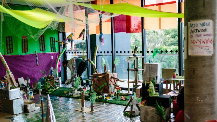 Back at the workshop space we were taken down a magical red hallway filled with windows & doors and were told to prepare ourselves for a Different Dimension! The girls thought the windows & doors were very cool, and excitedly chose their favourites. Once we entered the workshop space we discovered a room filled with everything we needed to create our own mini world that could be added to the growing installation in the corner. Armed with scissors, tape, cardboard, coloured paper and all sorts of recycled craft materials, Miss 5 was super excited to get to work creating her "Computer Flower Tower"!.