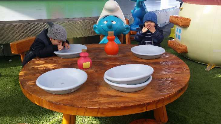 At On Four there is a FANTASTIC Smurf-like village/playground that kids big & small can roam around....from a swing set to Smurfs paintings and comic strips, some dozing off as the Smurfs get along with their usual routine, to little mushroom houses. It is a hard structure, like a playground, that even the parents can enjoy too!