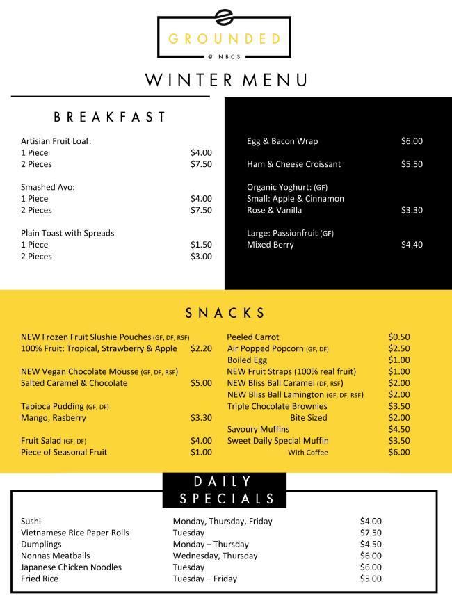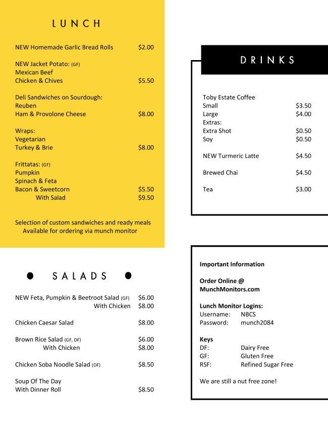 Menu items include: artesian fruit loaf, organic yoghurt, bliss balls, vegan salted caramel and chocolate mousse, Nonna's meatballs, Vietnamese rice paper rolls, and lots more. Check it out: