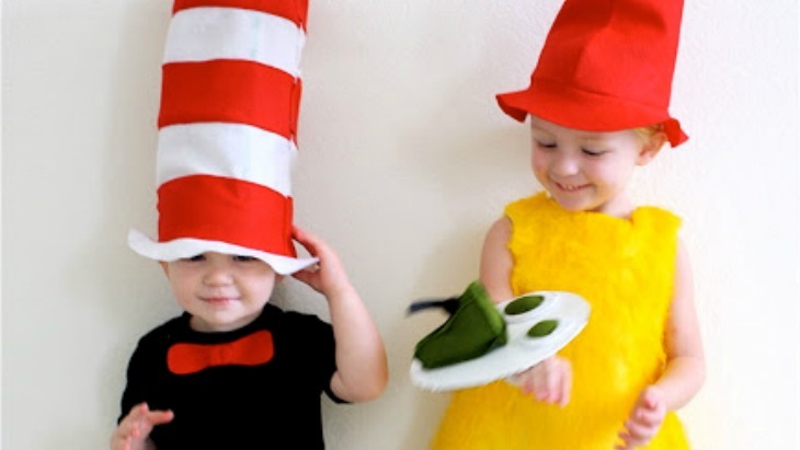 A tall red and white striped hat and a large red bow tie. They can be constructed out of cardboard. Draw on, or buy, a cat nose and whiskers. A cinch! For those green eggs fans, all you’ll need is a yellow dress and red hat (optional). For those green eggs, take a paint palette or a plastic plate and colour in some eggs.