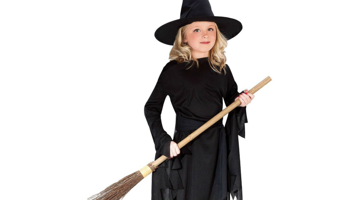 A black dress and tights – if you can cut them up, even better! Plus a witches’ hat and a broom. Get some crazy hair happening. A toy black cat will add a magic touch.