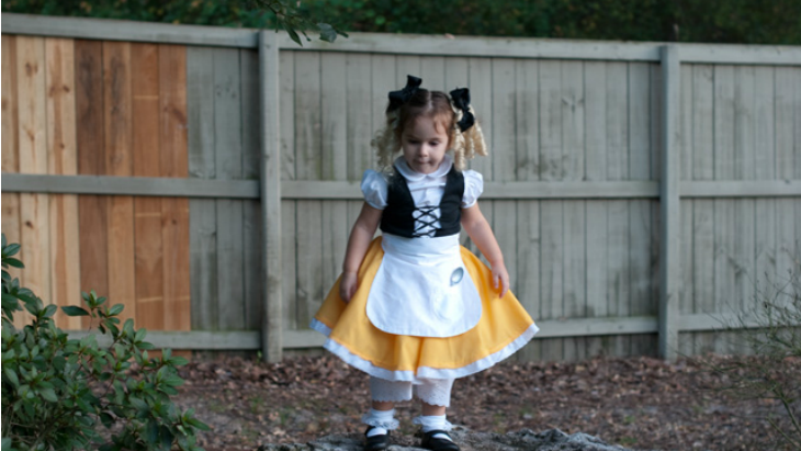 A pretty dress (apron optional) and pigtails with ribbons. Take three stuffed toy bears of various sizes. Done!