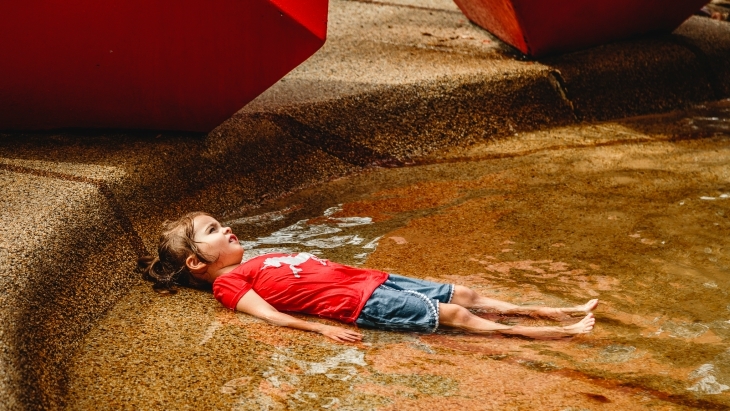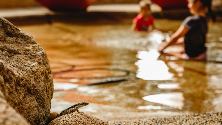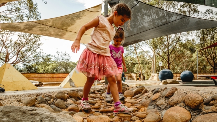 Up in the water play area is the giant slide. Younger kids will probably need a parent to go with them on this, Miss 6 went by herself and loved it. It does require proficiency with stairs though as there are a lot of stairs to climb to get to the top. The water play area has heaps of shade thanks to the trees and the shade cloths over the area. There is one picnic bench for adults to sit on, as well as a number of large rocks good for sitting on scattered around the two splash pools. The water isn’t very deep so even young children can enjoy the water, but as always, even with shallow water, keep your eyes on the kids at all times.