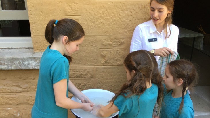 The children were given a brief history of the house to introduce the Wentworth family. We were then led to the original kitchen area where we washed our hands in the traditional manner using soap and a towel in an old basin before being seated at an old wooden table. Here we were told how we were going to make Milk Pudding (also known as Junket) and an Iced Tea but needed to collect some ingredients from the garden to create our meal.