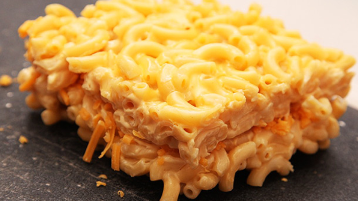 1. Fill a butter-rimmed baking tray with mac and cheese, and leave it to set in the fridge for about half an hour. It should be very solid and thick after this stage.