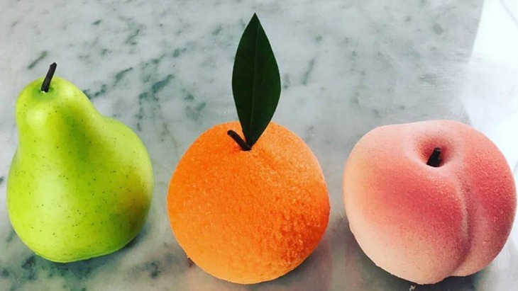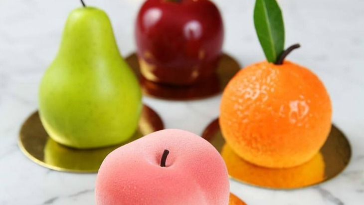 According to Broadsheet, the production process is as intricate as the fruity details. Each dessert is made from a mould to get the shape just right, coloured cocoa butter is used to get the perfect colour coating, the desserts are then sprayed, and dipped in a mirror glaze and cocoa-butter vanilla bean mixture.