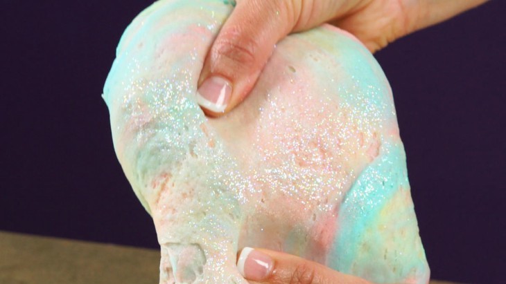 2. Transfer slime to a clean work surface, and knead slime, sprinkling with additional powdered sugar as necessary, until most of the oil is absorbed and mixture is less sticky. (If slime starts to get too sticky, lightly roll slime in 1/4 to 1/2 cup of the powdered sugar.) Sprinkle with 1/2 teaspoon of the glitter dust, and knead to incorporate.